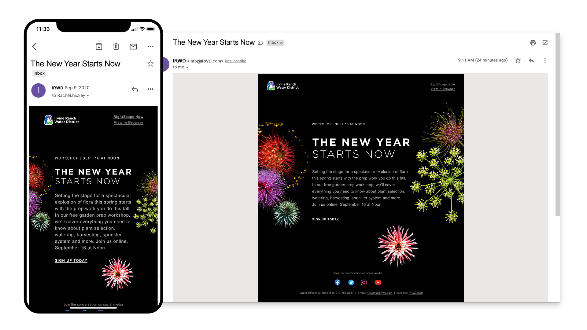 Having a spectacular garden in the spring requires prep work in the fall. So in the fall, we targeted Irvine Ranch Water District customers via email and social to encourage them to attend a fall garden workshop with one simple message: The New Year Starts Now.